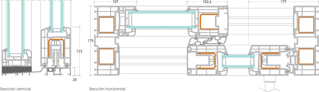 Secciones con marco y hoja estándar y solera de aluminio reducida.