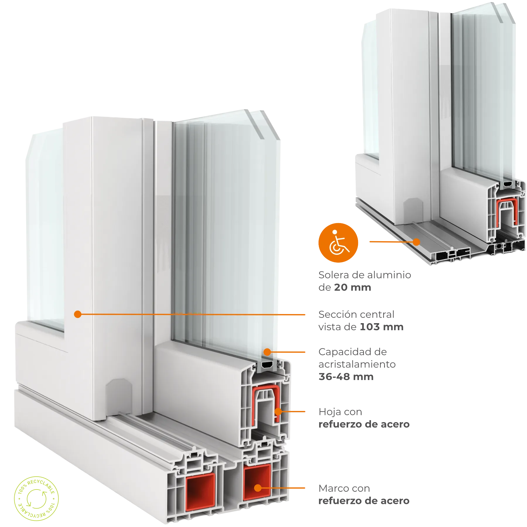 El sistema corredero elevador incorpora herraje con rodamiento de resina sintética capaz de aguantar hojas de hasta 300 kg de peso y manillas Dirigent con un estudiado diseño y funcionalidad.