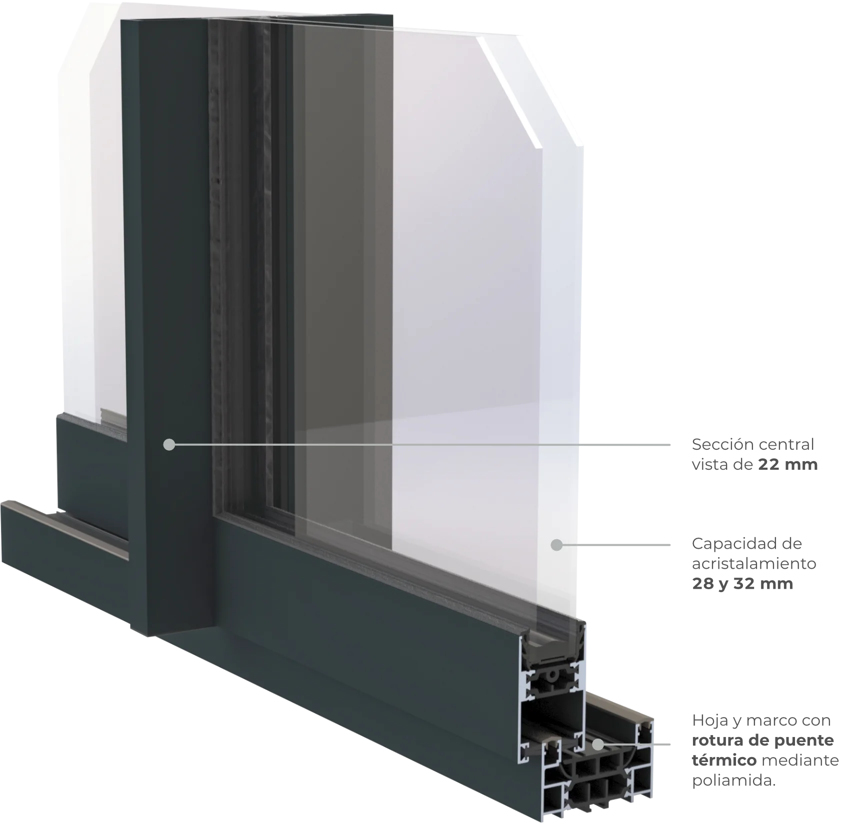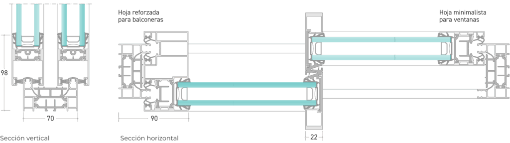 Diseñado para ser aislante. Perfiles de hoja y marco con rotura de puente térmico mediante poliamida. El escudo térmico de PVC en el marco inferior contribuye al rendimiento térmico y también a la estanqueidad al agua y permeabilidad la aire.