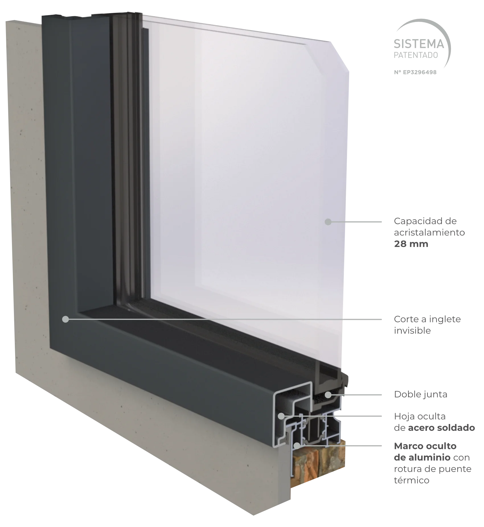 Invisible: marco oculto interior para integración con el pladur y bisagras invisibles cuando la ventana está cerrada.