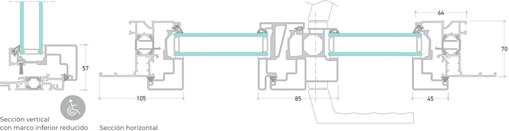 Opción con marco inferior reducido, marco con solape y doble maneta.