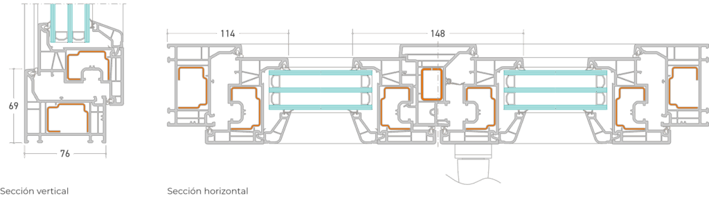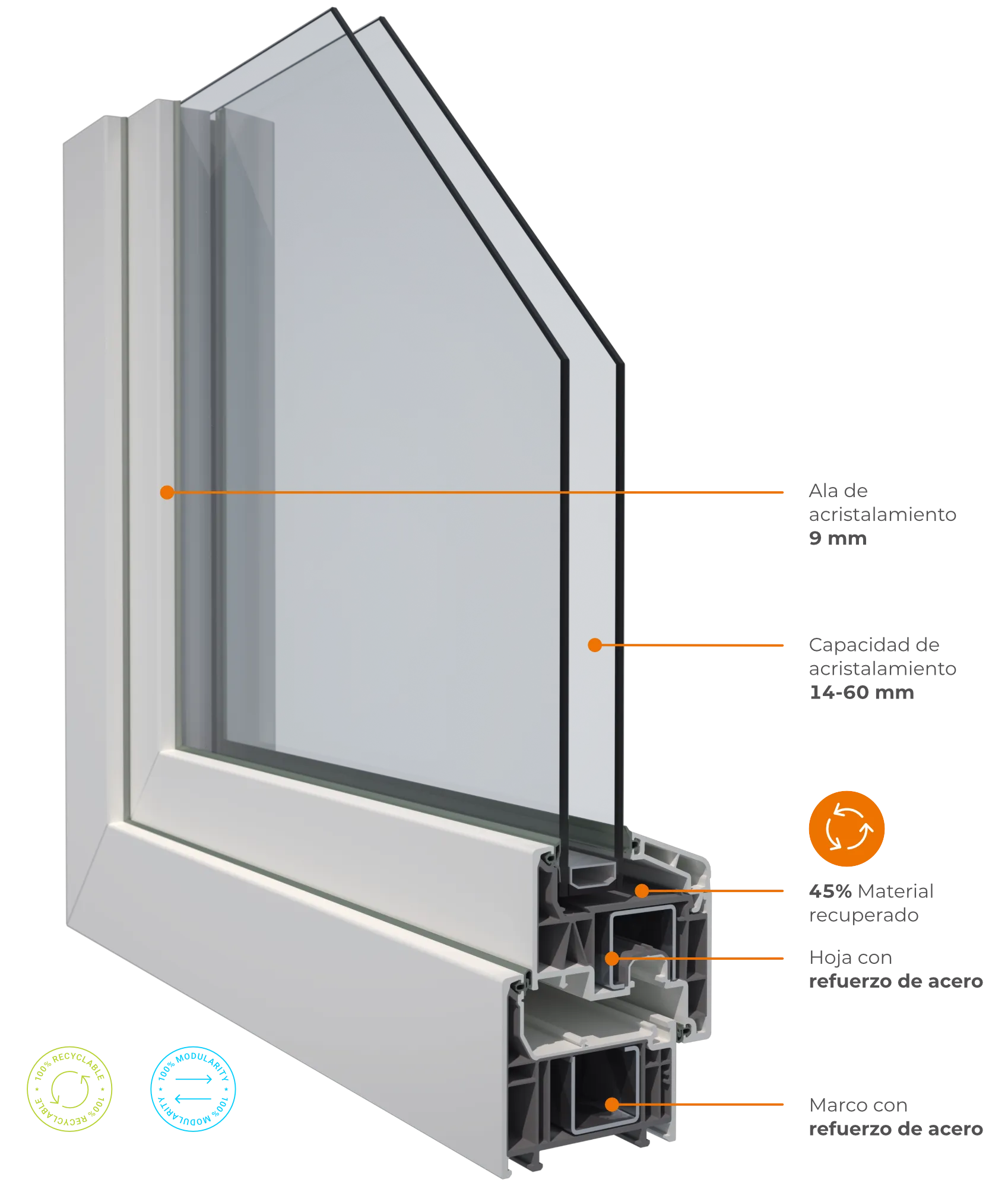 Es un sistema de carpintería de PVC con doble junta, posee 5 cámaras en marco y hoja, con un ala de acristalamiento minimalista y con un diseño contemporáneo.